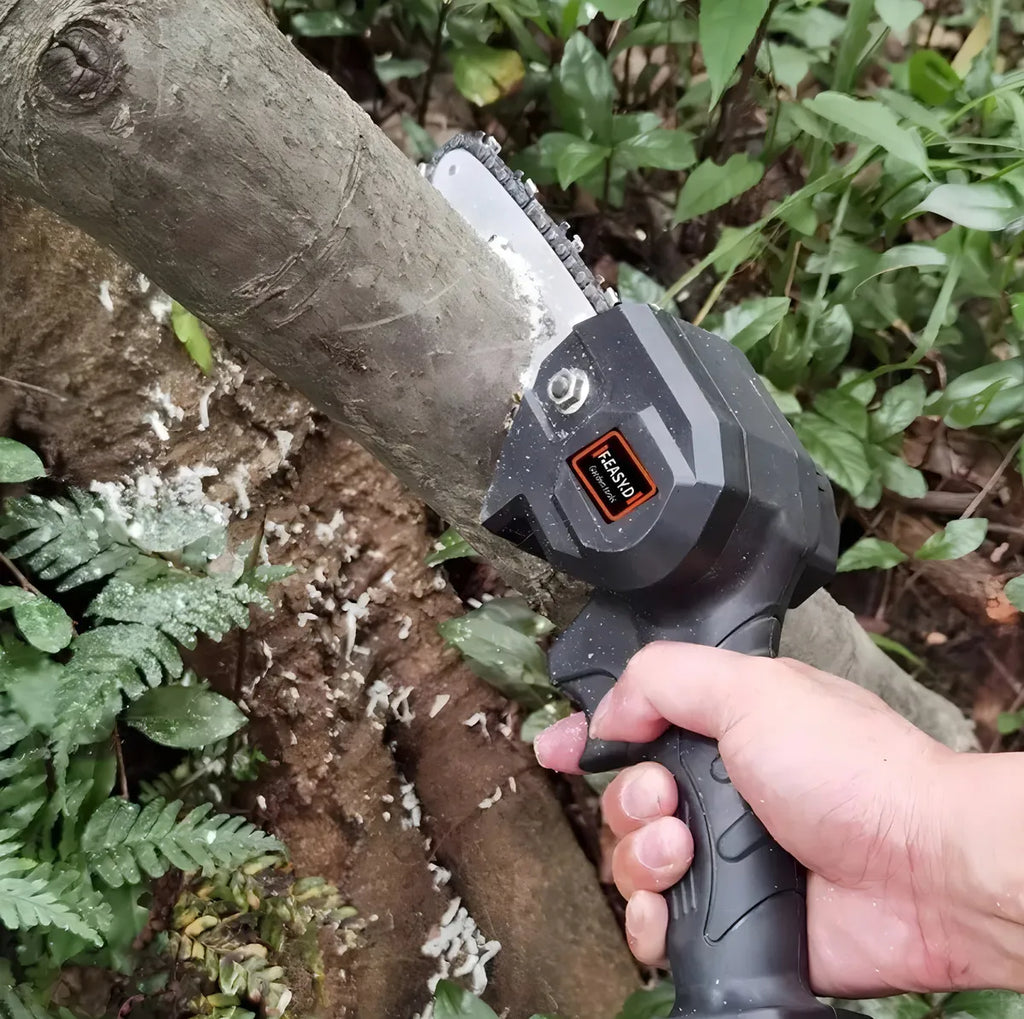 Projetada para ser usada com apenas uma mão, a mini motosserra oferece excelente ergonomia e controle, tornando a poda de galhos, arbustos e pequenas árvores mais ágil e segura, mesmo para usuários iniciantes.
